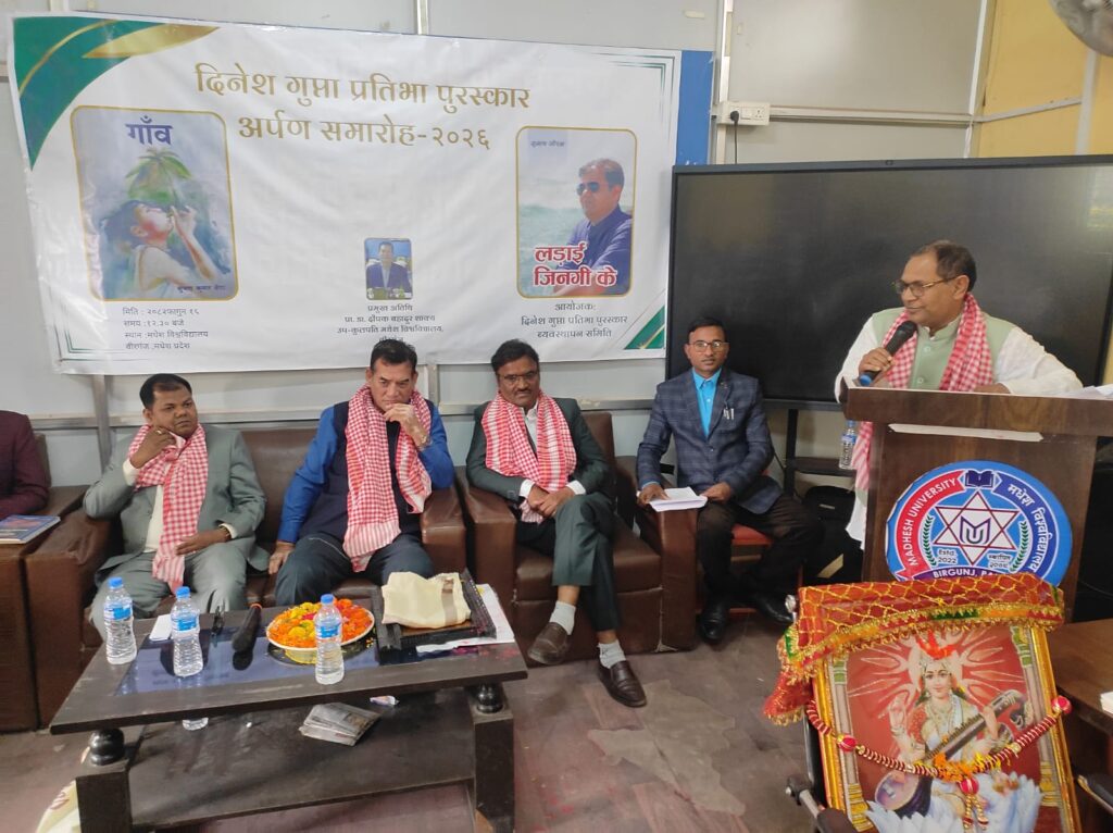 वीरगन्ज संवाददाता वीरगन्ज, फागुन १६पर्साको वीरगन्जस्थित मधेश विश्वविद्यालयको सभाकक्षमा शनिवार एक भव्य साहित्यिक समारोहका बीच ‘दिनेश गुप्ता प्रतिभा पुरस्कार–२०२६’ अर्पण गरिएको छ । बारा जिल्लाको बेलदारी निवासी युवा साहित्यकार सुवाष कुमार बैठा ‘सौरभ’ लाई उनको चर्चित भोजपुरी काव्य सङ्ग्रह ‘लडाई जिन्दगी के’ का लागि सो पुरस्कार प्रदान गरिएको हो ।